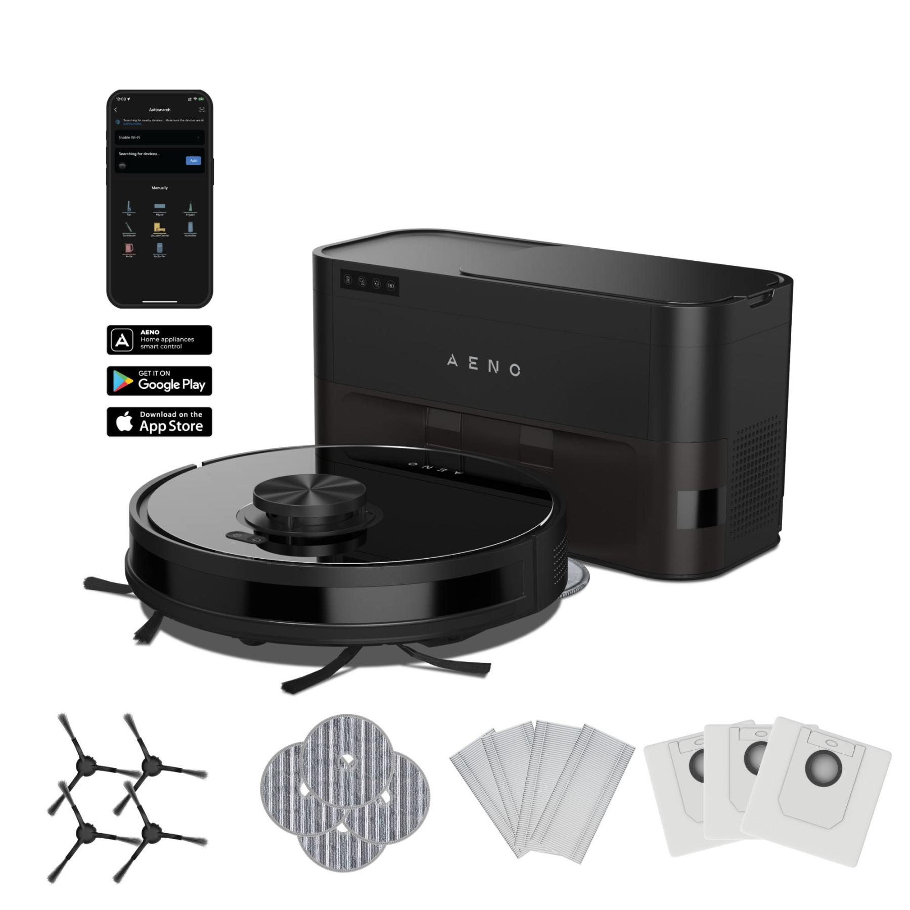 • príslušenstvo: 2 v 1 nádrž na prach a vodu, nádoba na prach, hlavná kefa, 4 x látkové mopy, 4 x bočné kefy, 4 x predfiltre a 4 x HEPA filtre, 3 x vrecká na prach, automatický zberač prachu, čistiaci nástroj, nabíjací kábel